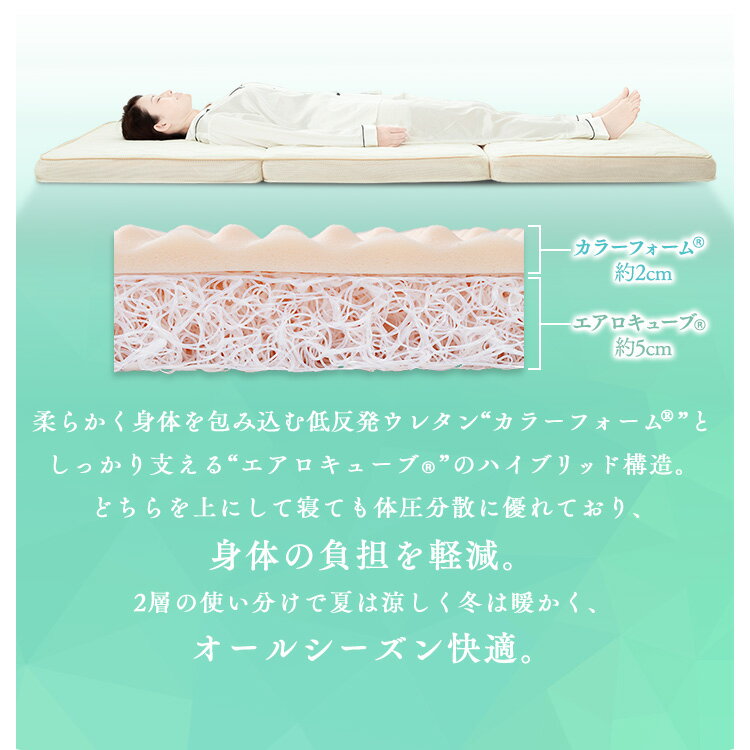 【寝心地を選べるリバーシブル仕様】柔らかく身体を包み込む低反発ウレタンカラーフォームとしっかり支えるエアロキューブの2層からなるハイブリット構造。